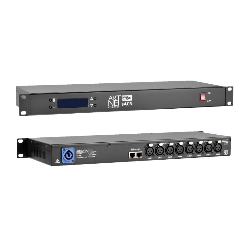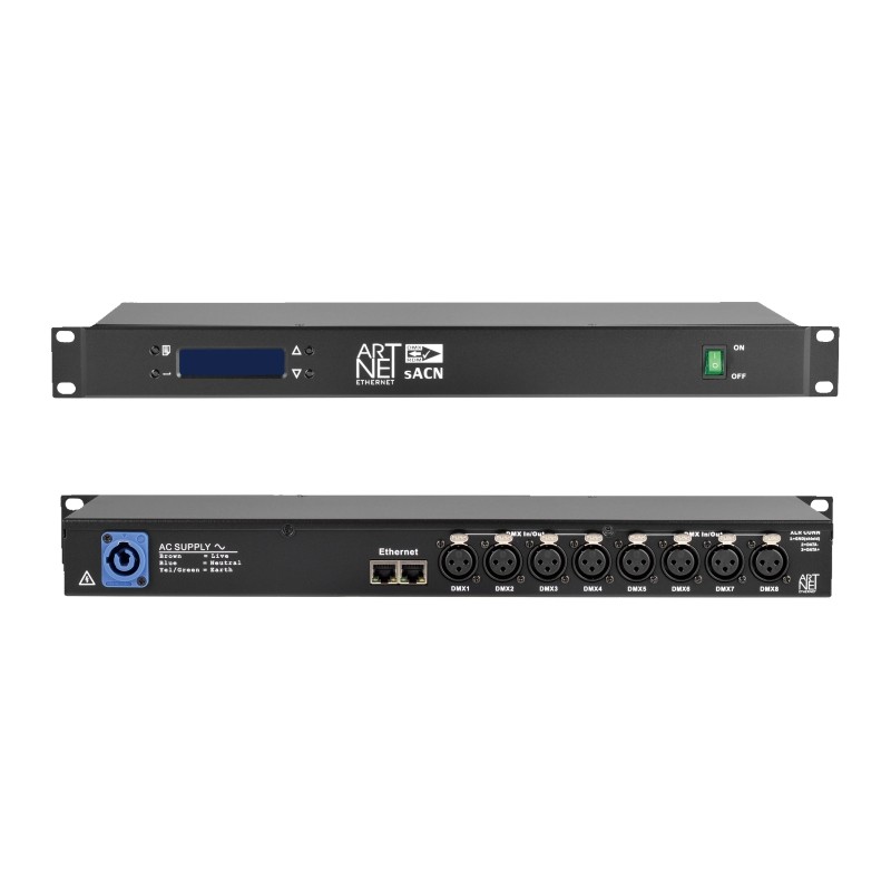 • 输入电压:110-220V AC • ArtNet / sACN 与 DMX 双向转换 • 8个标准DMX端口,使用XLR3卡侬接口 • 可调节DMX512输出频率 • 电气隔离,确保产品稳定性 • 10/100M网络端口,DHCP与固定IP地址 • LED显示屏,可通过按键、软件,WEB界面查看,设置参数 • 特有的箭头,显示 DMX 信号状态 • 1U 标准机架安装方式 • 产品尺寸:484x45x140mm