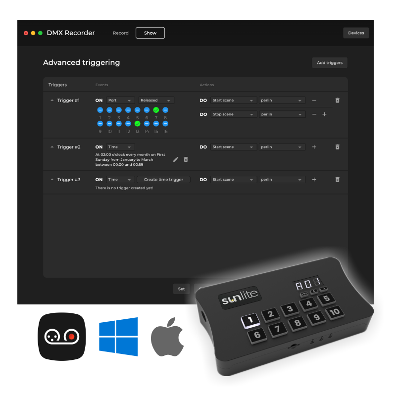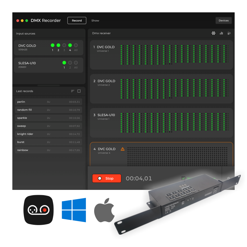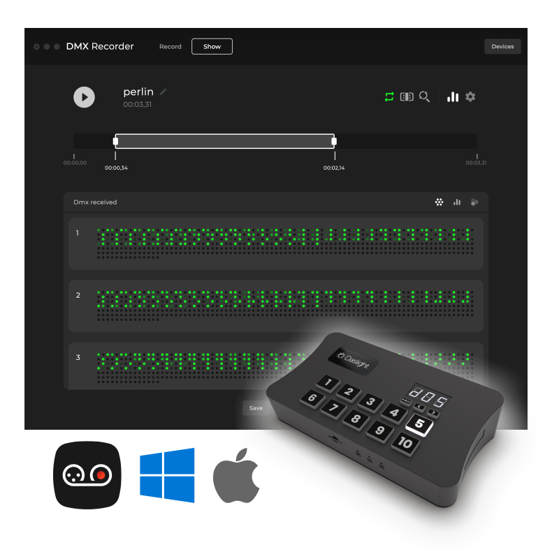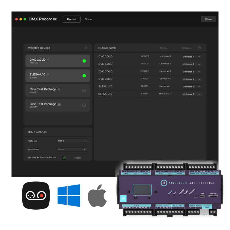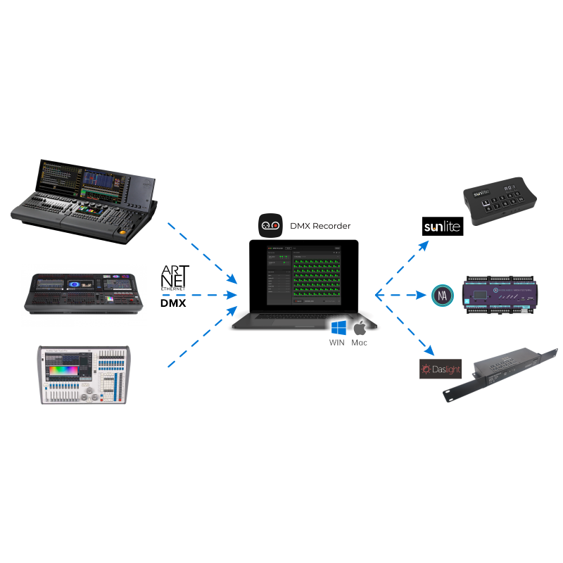 • 可录制DMX,ArtNet/eDMX信号 • 最多能录制100个ArtNet域 • 支持Nicolaudie, Sunlite, Daslight系列DMX主控制器 • 兼容Windows, MacOS系统 • 软件界面友好,操作简便 • 可对已录制节目进行编辑 • 支持定时设置与干接点触发控制 • 录制的节目,能快速复制,分发