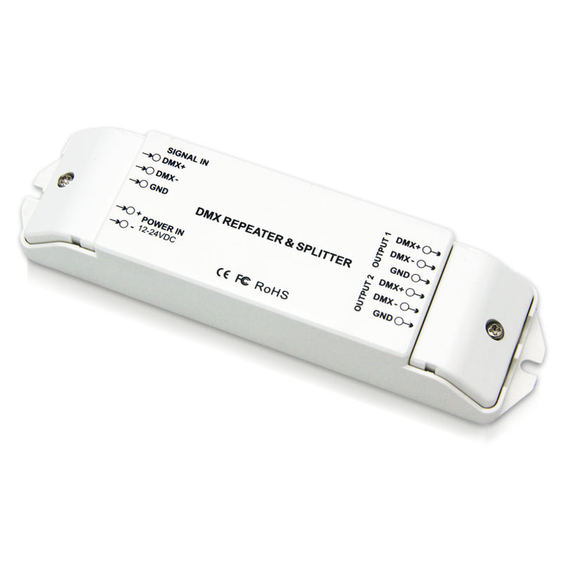 • 输入电压:12/24V DC • DMX/RDM回路:一进两出 • 输入与输出端口,均采用光电隔离 • 隔离耐压3000V DC • DMX512/RDM 信号放大,延长信号传输距离 • 端口间相互独立,不共地 • DMX信号线接错保护 • 螺丝安装固定