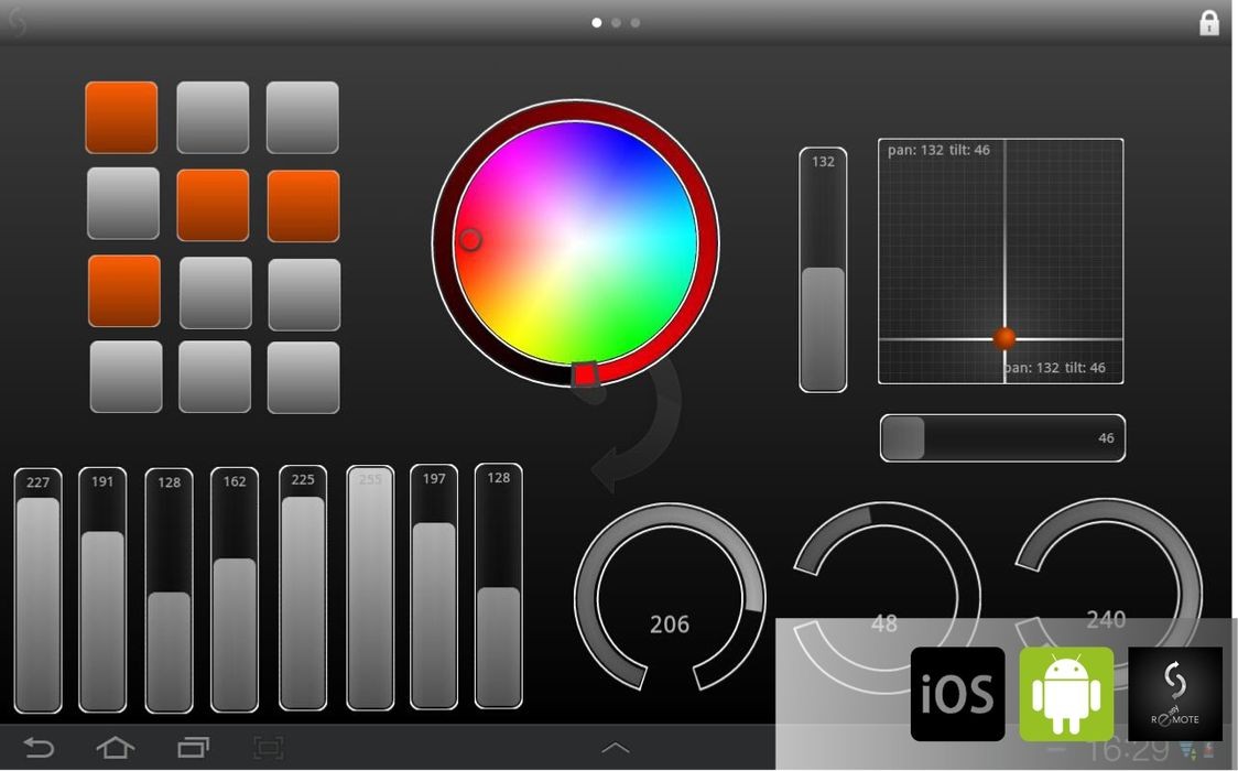 使用 Easy Remote ,可以通过 WiFi 网络,对局域网内的 DMX 控制器进行无线操作:触发场景,调节速度,亮度,调节灯具的 XY 坐标等。Easy Remote 的界面,你可以自己设计:旋转按钮,推杆,旋钮,颜色盘,XY座标盘等。