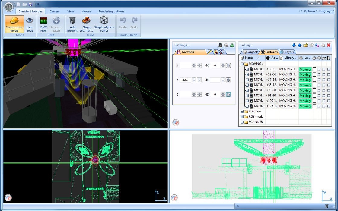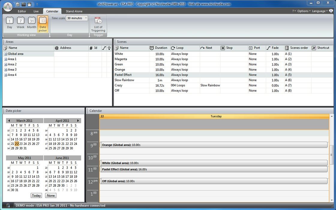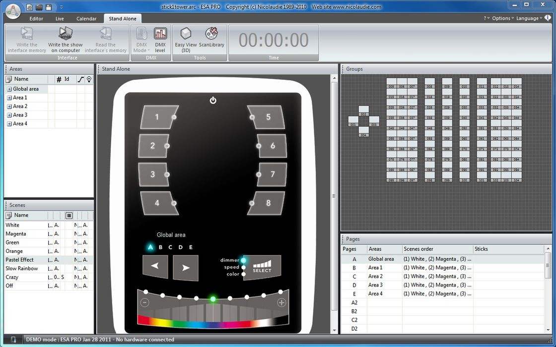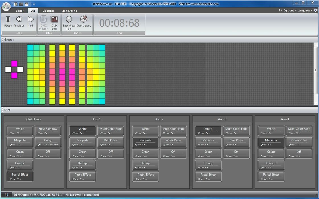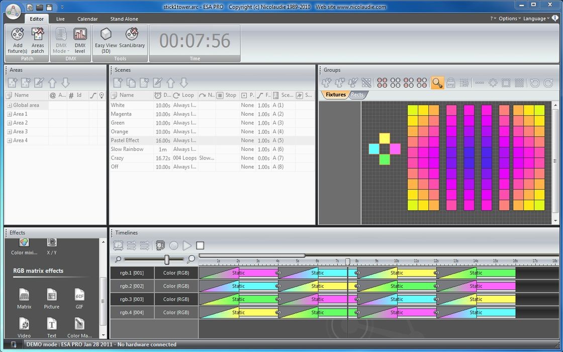 ESA Pro DMX 灯光编辑软件,以其强大的灯光编辑功能,友好的操作界面而广受欢迎。ESA Pro 可以导入音频,并使用时间轴进行效果编辑,直观,方便。软件可以控制各种 DMX 灯具,使用内置的灯光曲线,你可以轻松地创建很多绚丽的灯光效果。