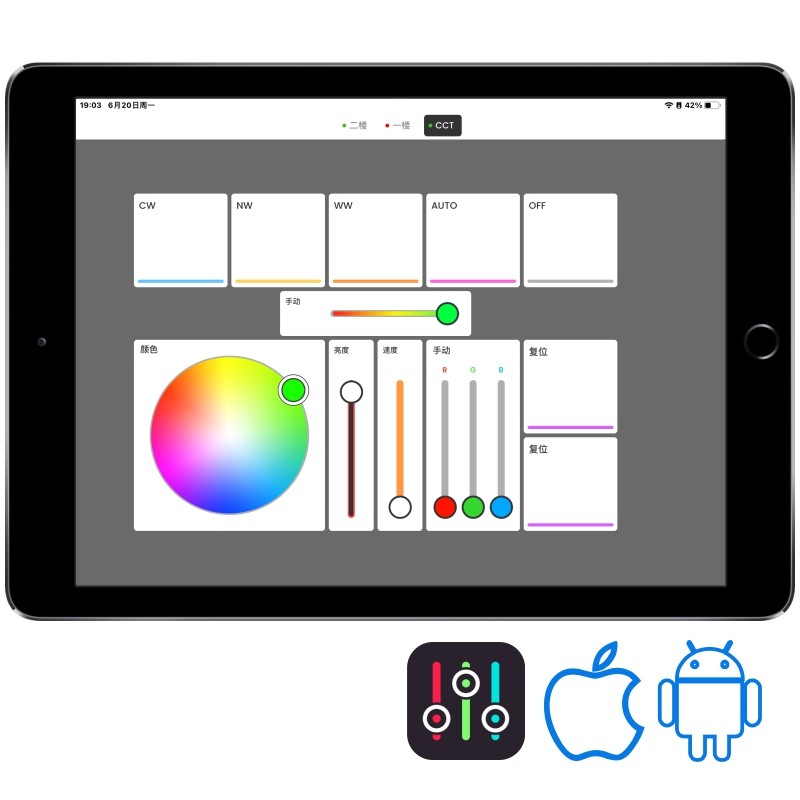 • iOS / 安卓 • iPad / iPhone / 安卓Pad / 场景面板 • 自定义控制界面 • 网格化视图,简单易用 • 可锁定编辑功能 • 支持Sunlite, SLESA, DINA, STICK, Daslight网络灯光控制器 • 内置场景按键, 亮度,速度,手动调节,颜色盘 • 可分区域控制